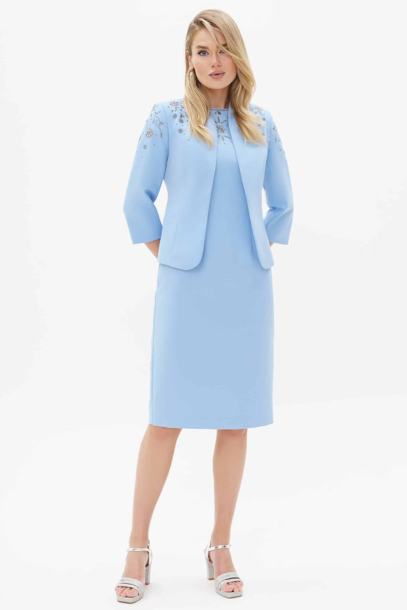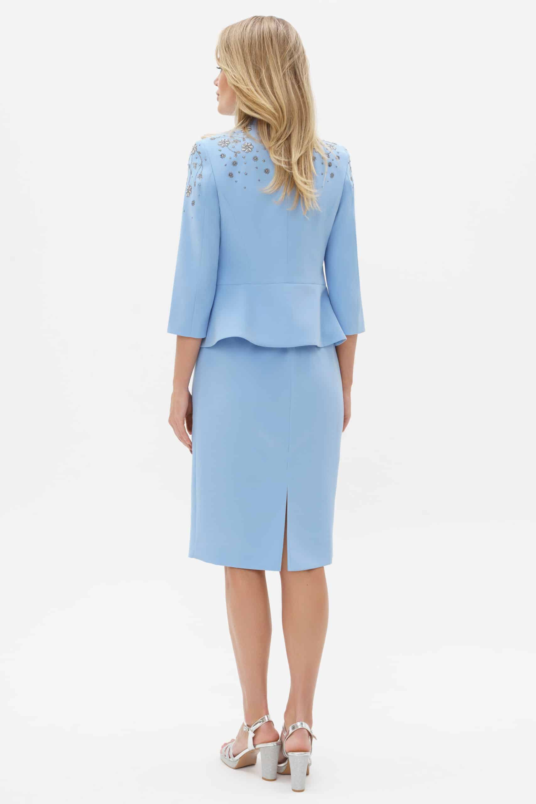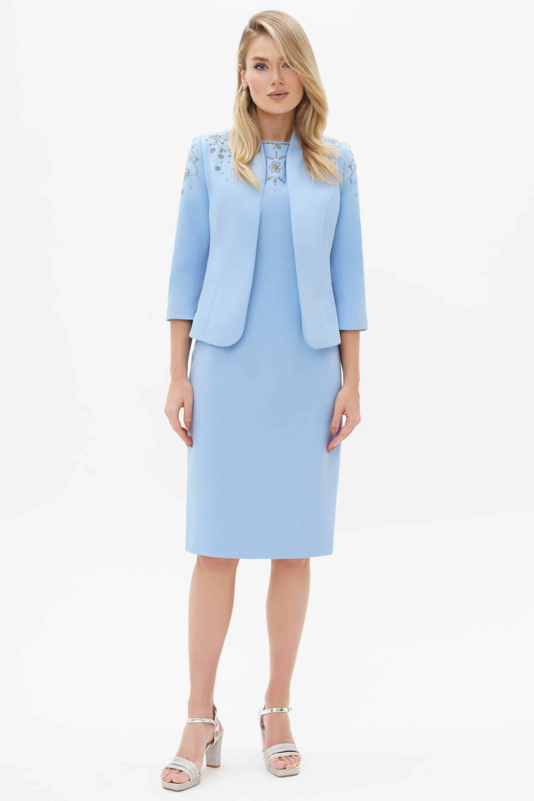Костюм женский состоит из жакета полуприлегающего силуэта на подкладке и платья полуприлегающего длиной миди. В верхней части жакета по переду, спинке и рукавам и по переду верхней части платья — вышивка. Костюм может быть как нарядный, так и для повседневной носки.