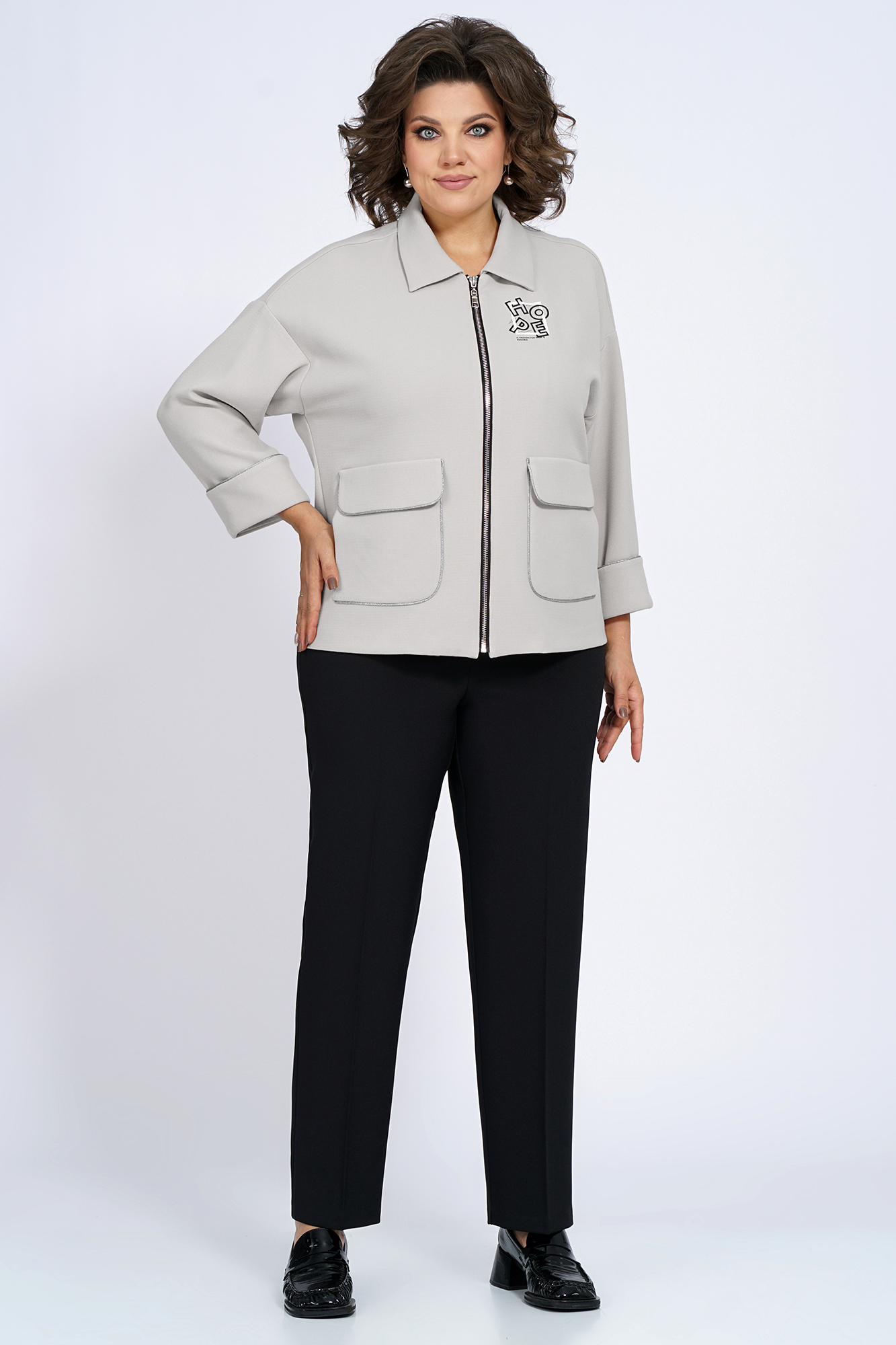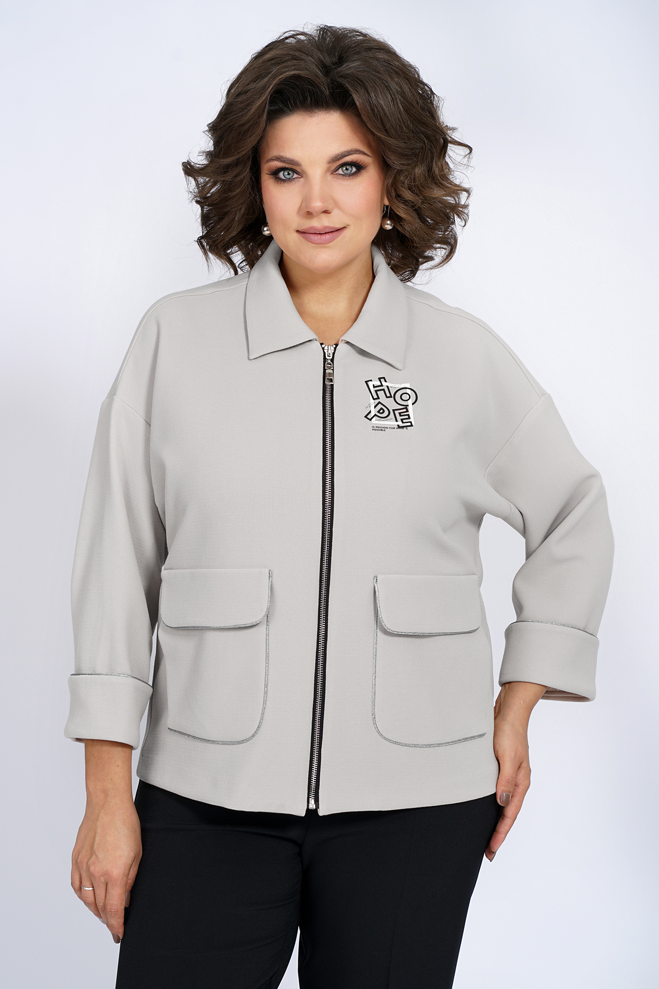 Жакет прямого, свободного силуэта, с отложным воротником, с застёжкой на молнию, со спущенной линией плеча. Перед с накладными карманами (с боковым входом) и клапанами. Рукава втачные, одношовные, длинные, понизу с притачными отложными манжетами. Жакет декорирован по краю клапана, кармана, манжеты отделочным кантом.