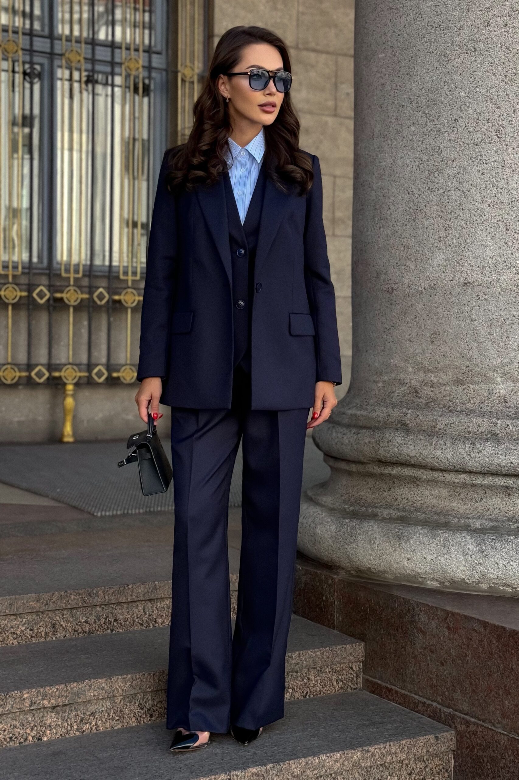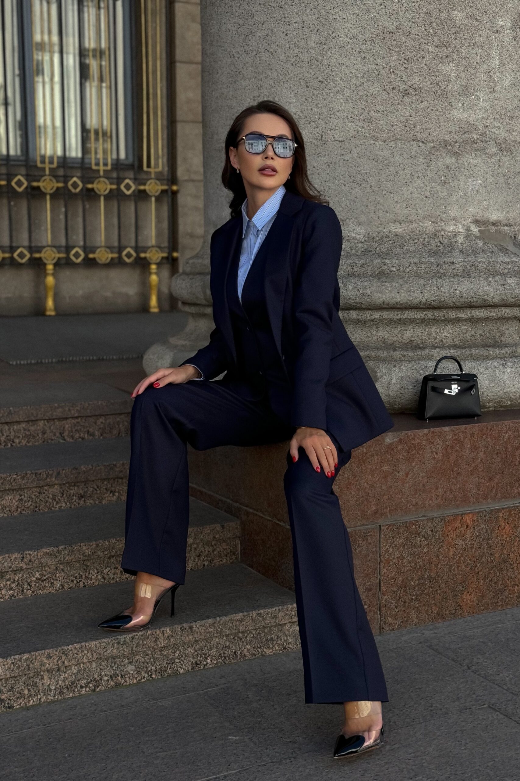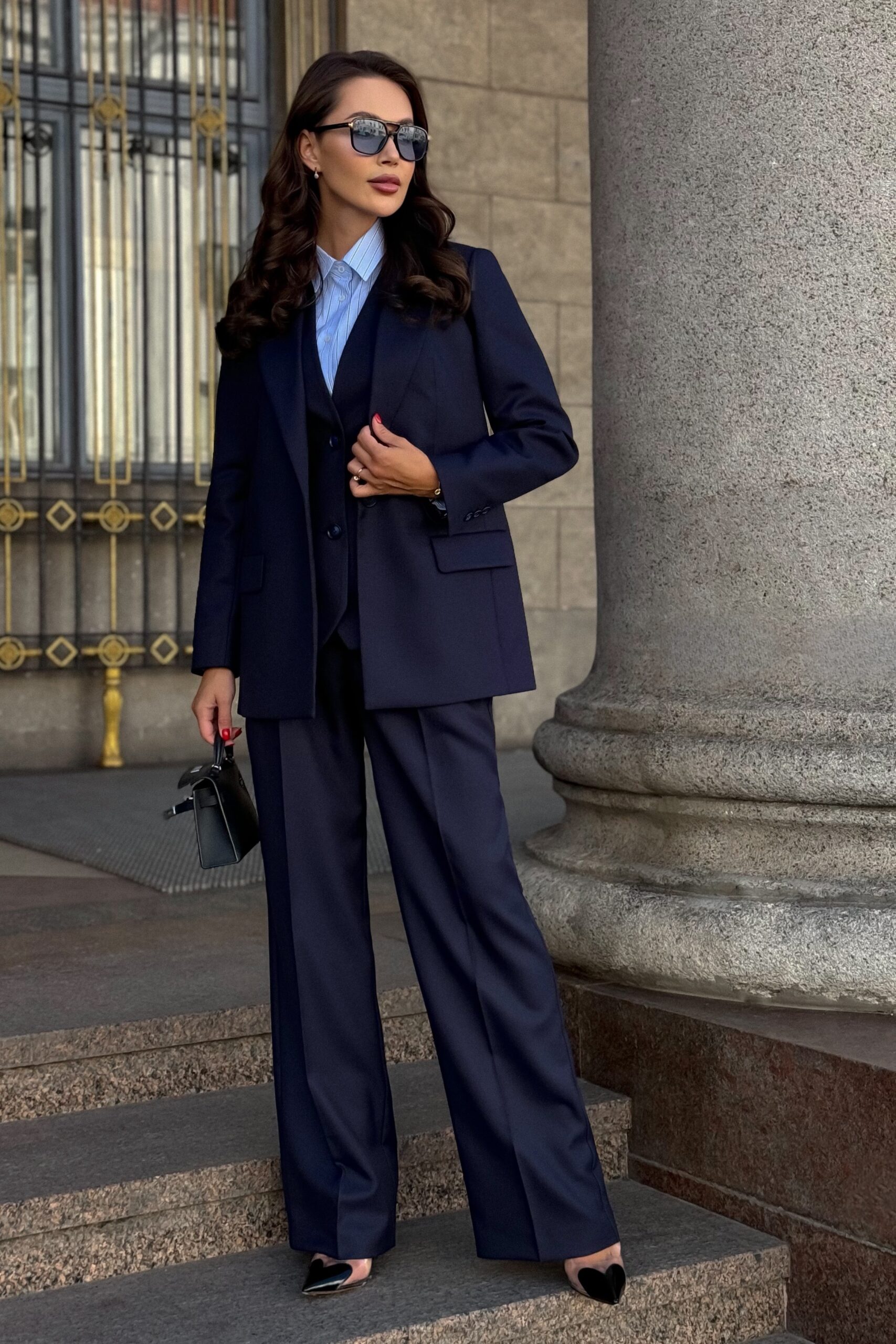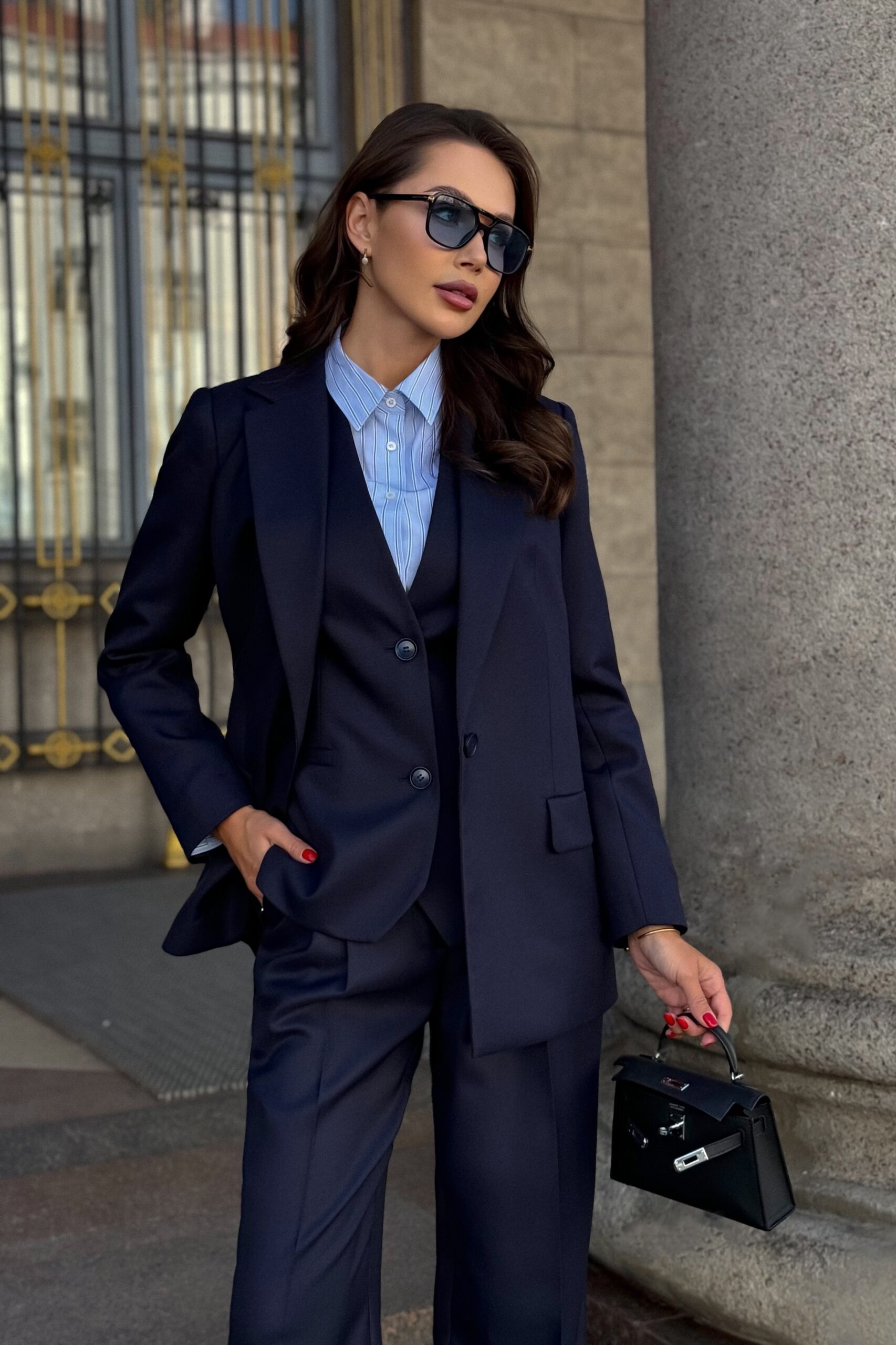 Женский брючный костюм-тройка из шерстяной ткани. Этот стильный и практичный наряд станет незаменимым элементом вашего делового гардероба. Костюм состоит из трёх предметов: классических брюк, стильного жилета и элегантного жакета. Благодаря этому вы сможете создавать разнообразные образы, комбинируя их между собой или используя каждый элемент отдельно. Костюм идеально подойдёт для повседневной носки, официальных и праздничных мероприятий.
