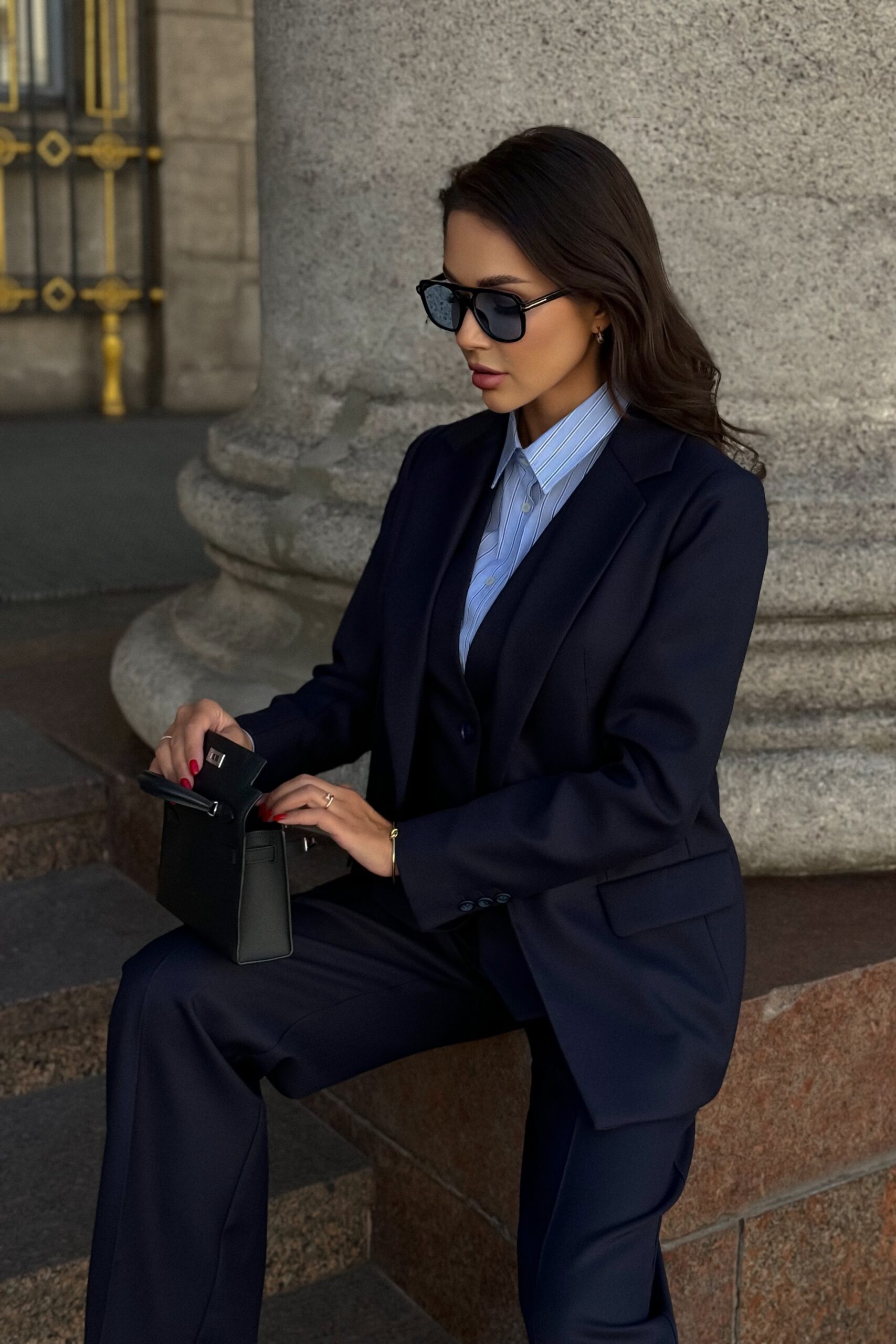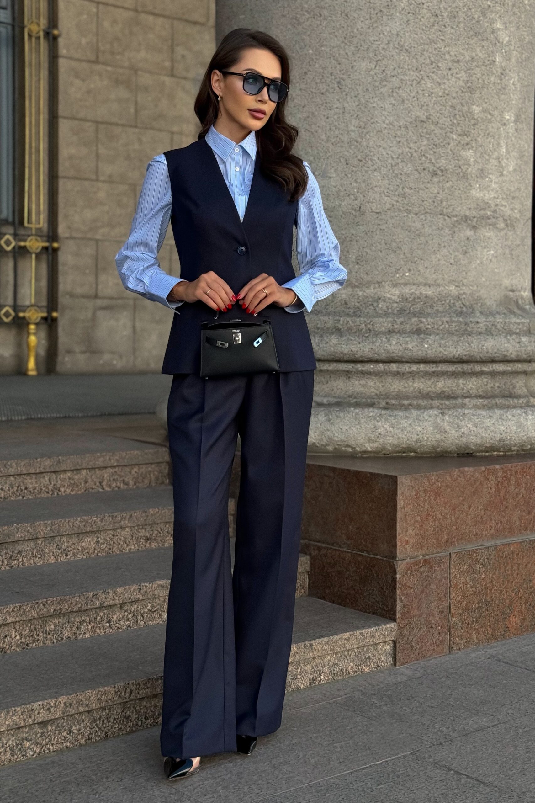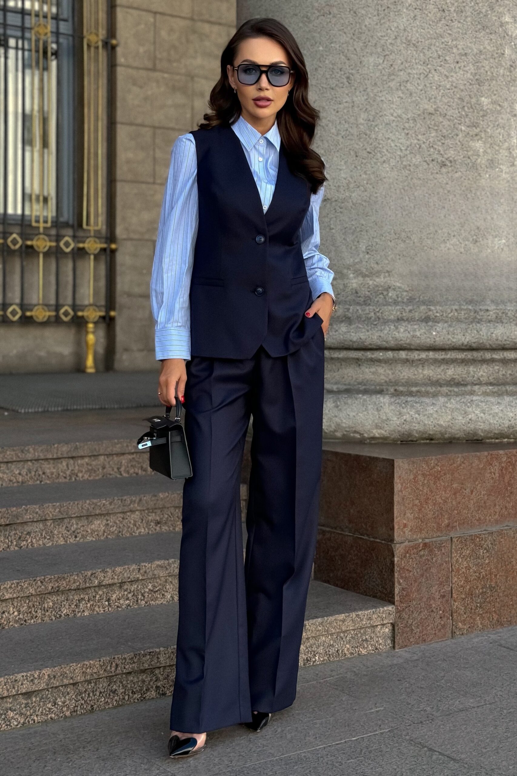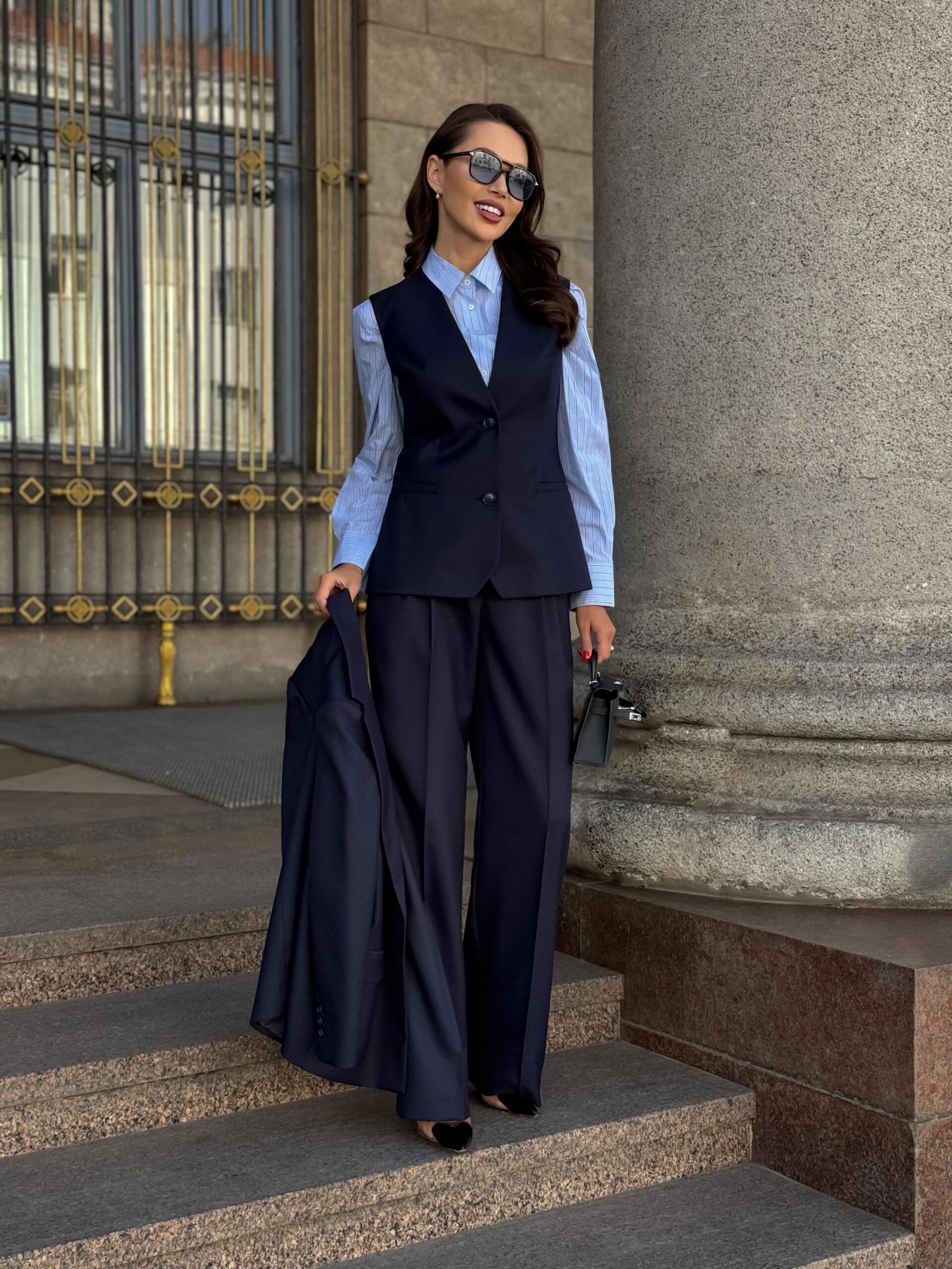 Женский брючный костюм-тройка из шерстяной ткани. Этот стильный и практичный наряд станет незаменимым элементом вашего делового гардероба. Костюм состоит из трёх предметов: классических брюк, стильного жилета и элегантного жакета. Благодаря этому вы сможете создавать разнообразные образы, комбинируя их между собой или используя каждый элемент отдельно. Костюм идеально подойдёт для повседневной носки, официальных и праздничных мероприятий.
