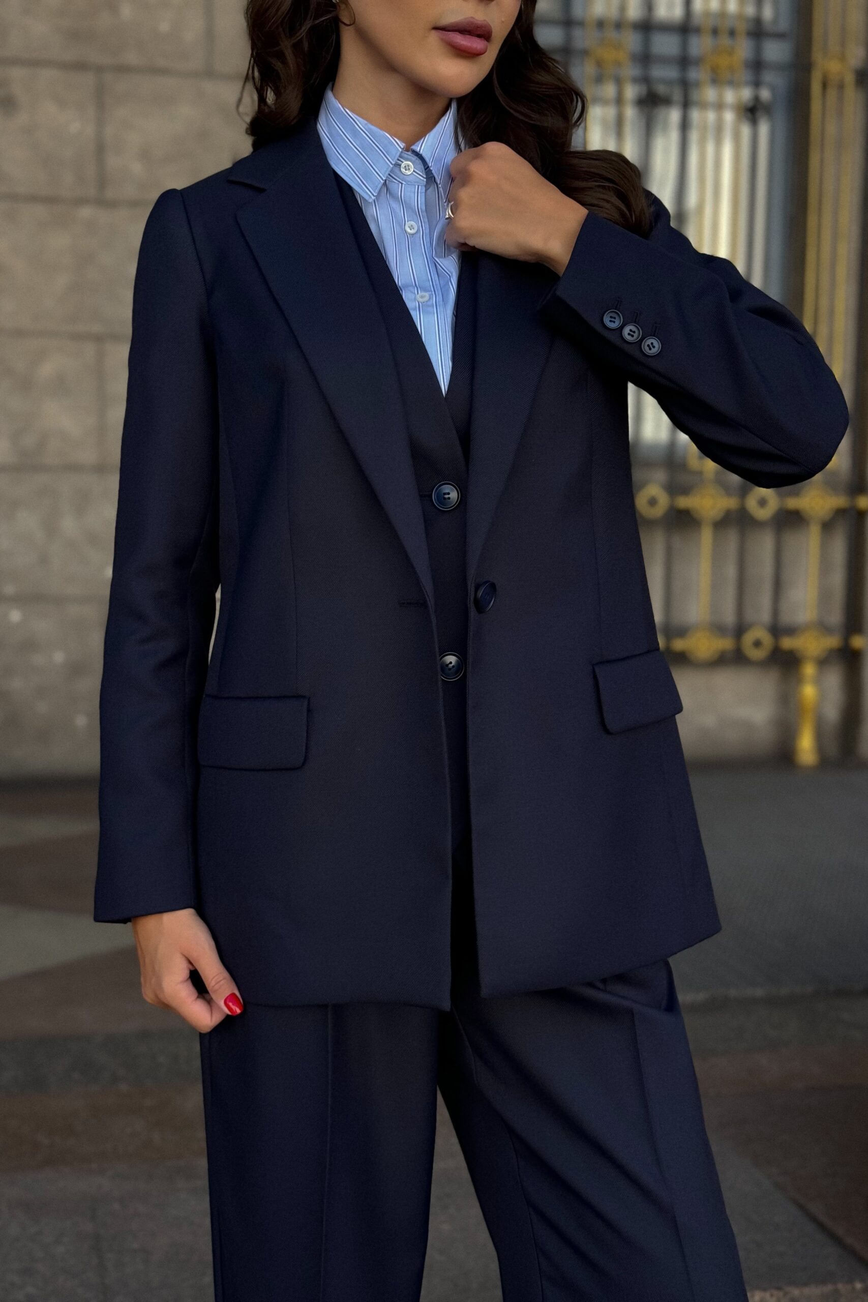 Костюм женский 3-х предметный, состоящий из жакета, жилета и брюк, выполненных из костюмной ткани, предназначен для повседневной носки.