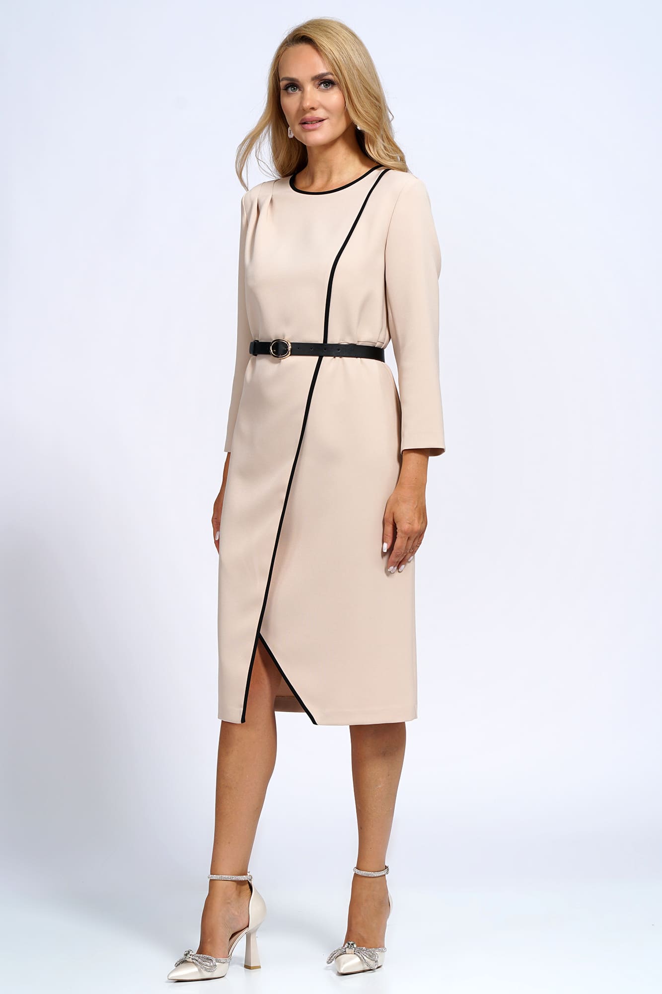 Перед с мягкими складками от правого плечевого шва и рельефный шов, понизу запах (срезы обработаны окантовочным швом). Спинка со средним швом и талевыми выточками. Рукава втачные, двухшовные, длиной ¾. Горловина круглой формы обработана окантовочным швом. В дополнении ремень.