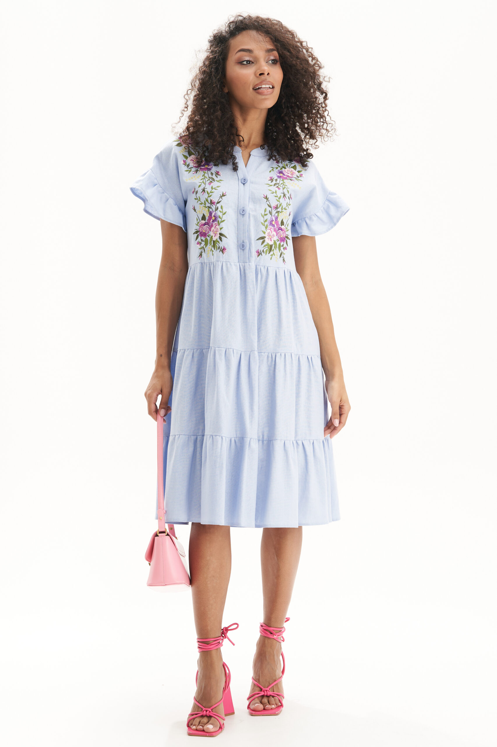 Платье женское с декоративной симметричной вышивкой по полочкам, длиной за колено, трапециевидного свободного силуэта, отрезное по линии талии, со спущенными цельнокроеными рукавами.