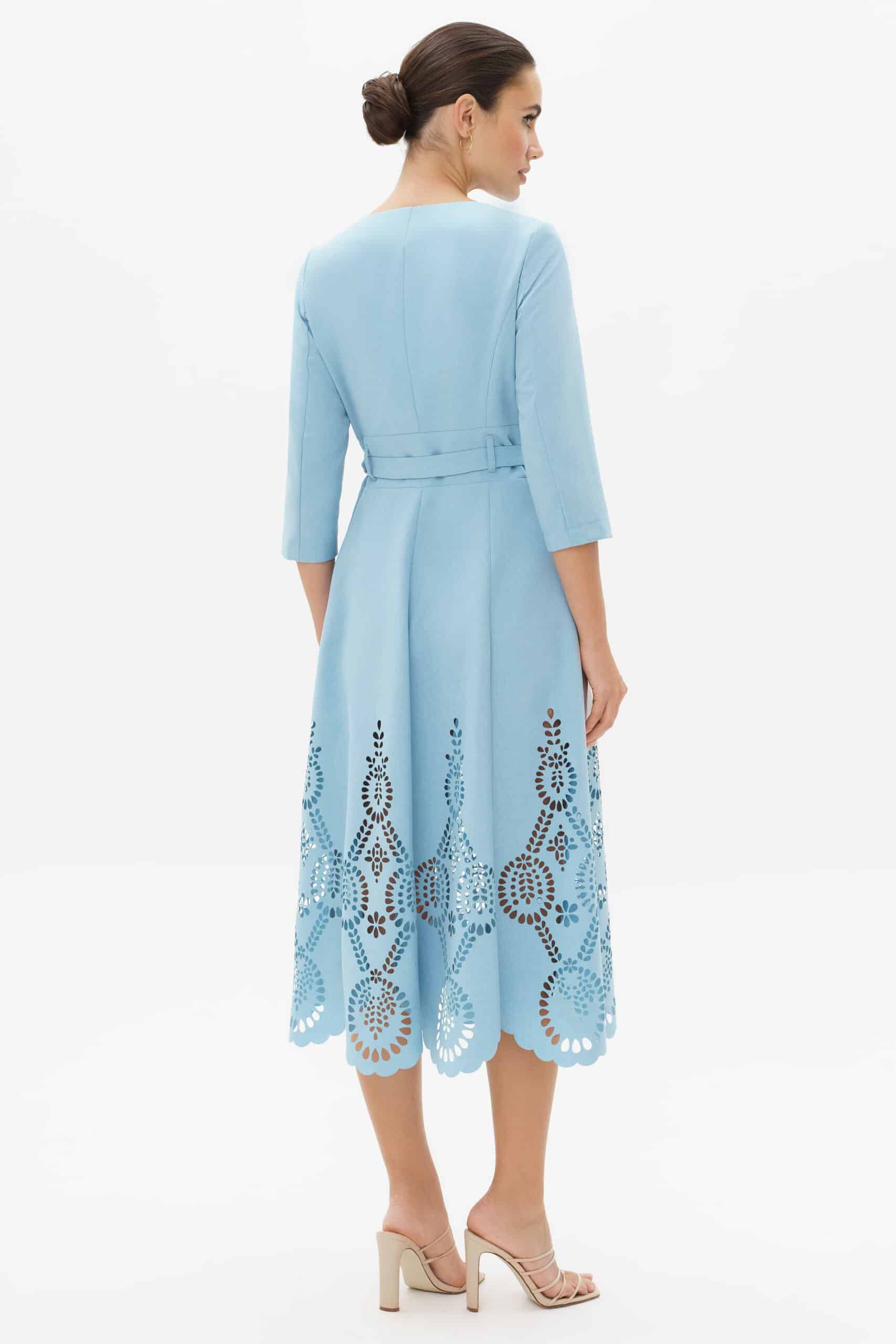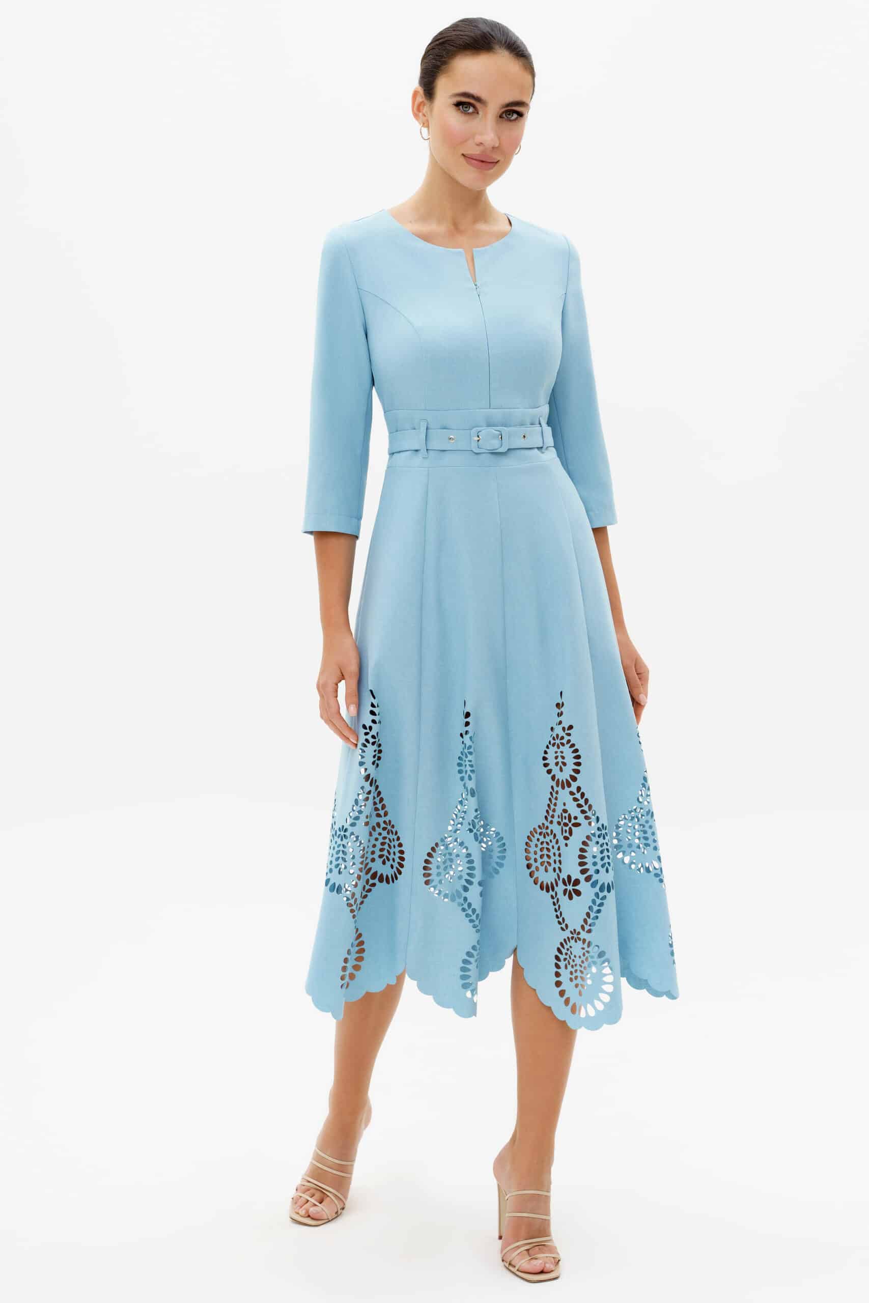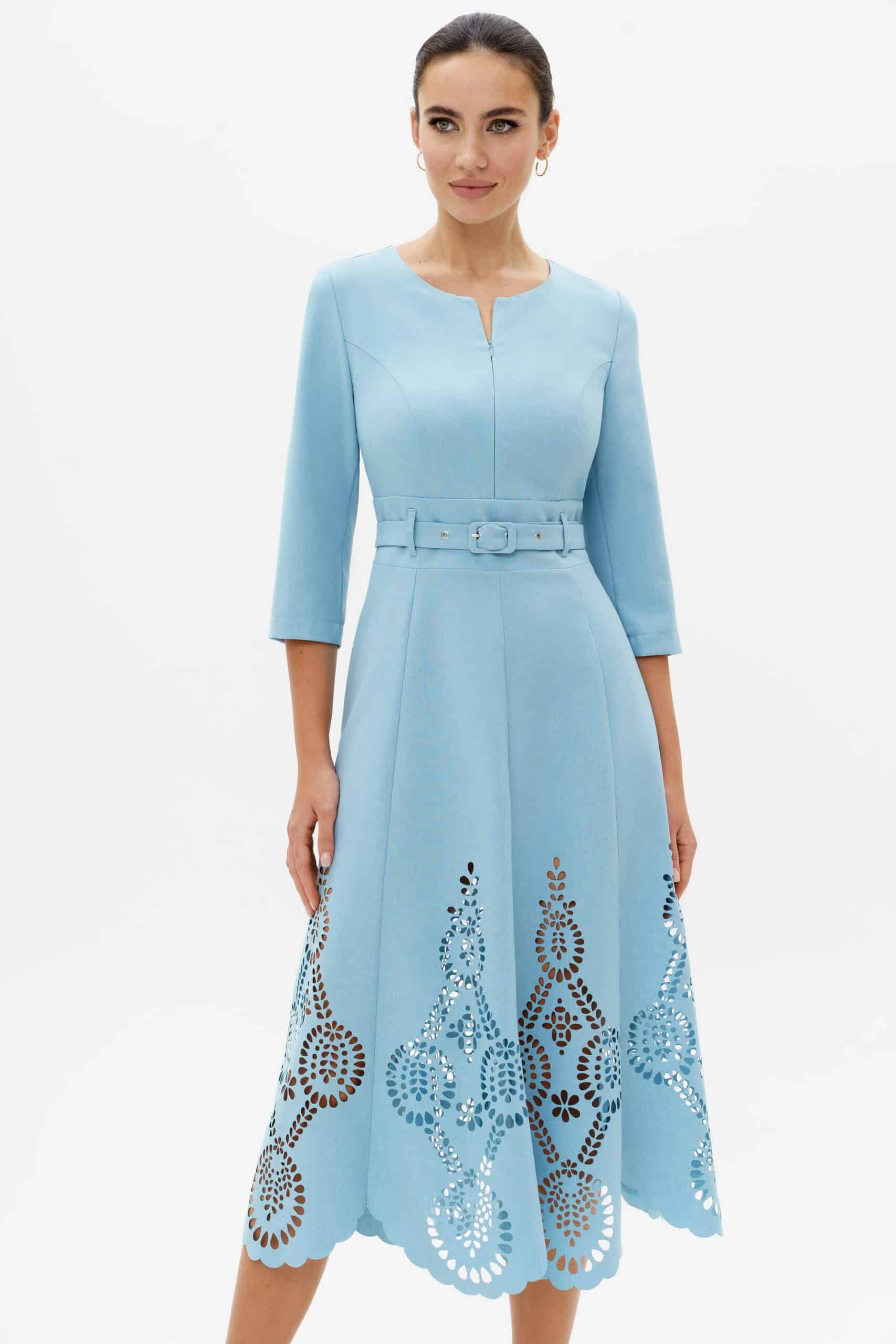 Платье женское полуприлегающего силуэта с художественной перфорацией по низу изделия. Изготовлено из плательной ткани лен-вишер, отрезное по линии талии с втачным поясом. Может быть как нарядным так и для повседневной носки.